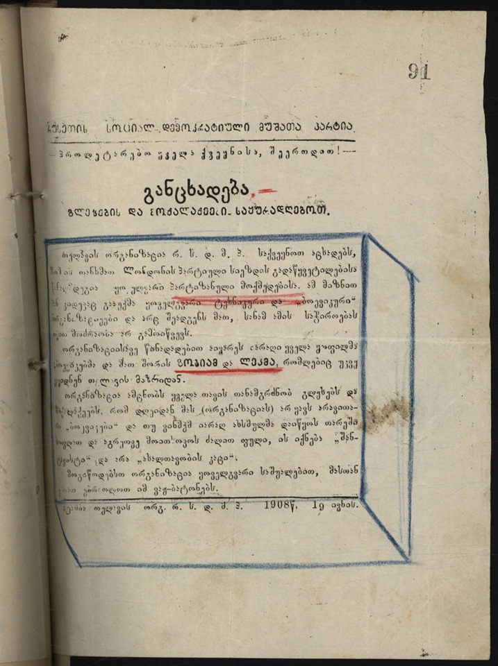 თელავის ორგანიზაცია რ.ს.დ.მ.პ. საქვეყნოდ აცხადებს – თანახმად ლონდონის პარტიული სიეზდის გადაწყვეტილებისა წინააღმდეგია ყოველგვარი პარტიზანული მოქმედებისა, ამ მიზნით კიდევაც გააუქმა ყოველგვარი ტექნიკური და ბოევიკური ორგანიზაციები და არ შეადგენს მათ, სანამ ამის საჭიროებას მოძრაობა არ გამოიწვევს.