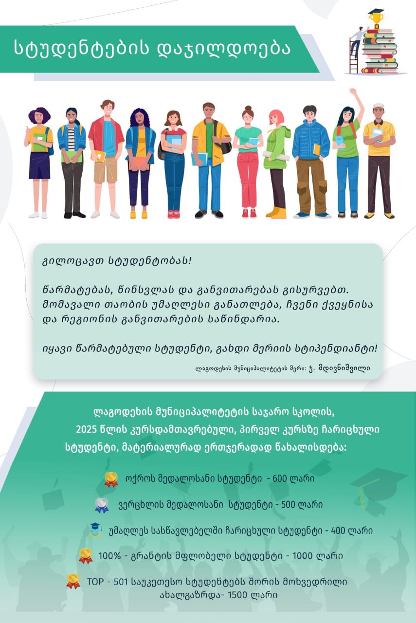 ლაგოდეხის მუნიციპალიტეტის მერია, ტრადიციულად, 2025 წელსაც დააჯილდოებს საჯარო სკოლების კურსდამთავრებულებს, რომლებმაც სწავლა უმაღლეს საგანმანათლებლო დაწესებულებებში გააგრძელეს.