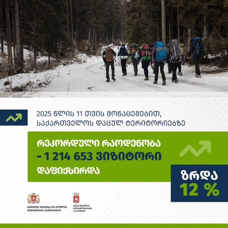 Home რეგიონი 2025 წლის 11 თვის მონაცემებით საქართველოს დაცულ ტერიტორიებს რეკორდული რაოდენობის 1 214... რეგიონი 2025 წლის 11 თვის მონაცემებით საქართველოს დაცულ ტერიტორიებს რეკორდული რაოდენობის 1 214 653 ვიზიტორი ესტუმრა 17/12/2025 FacebookTwitterPinterestWhatsApp 2025 წლის 11 თვის მონაცემებით, საქართველოს დაცულ ტერიტორიებს რეკორდული რაოდენობის 1 214 653 ვიზიტორი ესტუმრა ვიზიტორთა რიცხვი ,გასულ წელთან შედარებით, 12%-ით არის გაზრდილი.
