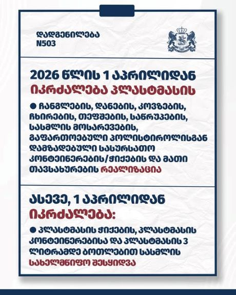 საქართველოს მთავრობის გადაწყვეტილებით, 2026 წლის 1 აპრილიდან პლასტმასისგან დამზადებული ჩანგლების, დანების, კოვზების, ჩხირების, თეფშების, საწრუპების, სასმლის მოსარევების, ასევე გაფართოებული პოლისტიროლისგან (EPS) დამზადებული სასურსათო კონტეინერების და მათი თავსახურების, ჭიქების და მათი თავსახურების რეალიზაცია აიკრძალა. აღნიშნული პროდუქციის იმპორტი და წარმოება 2026 წლის 1 იანვრიდან უკვე აკრძალულია.