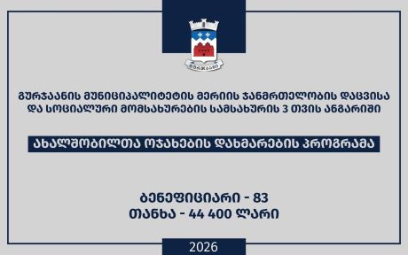 გურჯაანის მუნიციპალიტეტში, 2026 წლის პირველი სამი თვის განმავლობაში, ახალშობილთა ოჯახების დახმარების პროგრამით 83 მა ოჯახმა ისარგებლა